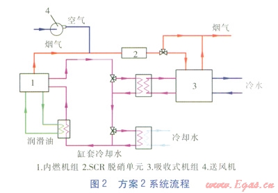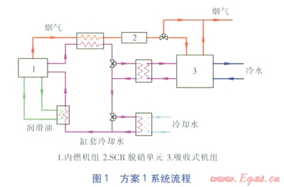 方案1系統(tǒng)流程見圖1。內(nèi)燃機組煙氣經(jīng)煙氣—水換熱器后進(jìn)入SCR脫硝單元,脫硝后進(jìn)入煙氣熱水型溴化鋰吸收式冷水機組(以下簡稱吸收式機組),放熱后與過剩煙氣一同排放。缸套冷卻水分別經(jīng)兩級換熱器降溫后,再吸收潤滑油部分熱量,最終回到內(nèi)燃機組缸套。