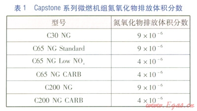 微燃機組的基本工作原理是空氣經(jīng)壓縮機增壓后與天然氣在燃燒室內(nèi)燃燒,產(chǎn)生的高溫高壓煙氣推動透平做功帶動發(fā)電機發(fā)電。作為最早研發(fā)也是目前最成功的微燃機組之一——Capstone系列微燃機組,集透平、高效回?zé)崞?、空氣軸承、高速永磁發(fā)電、超低排放、高度集成的數(shù)字電力轉(zhuǎn)換技術(shù)于一體。該系列微燃機組只有一個運動部件,結(jié)構(gòu)緊湊,采用空氣冷卻,無需潤滑油及冷卻液,運行維護(hù)費用低,燃料適應(yīng)性強,可實現(xiàn)模塊化組裝,煙氣余熱具有較高的利用價值。由于采用稀薄燃燒技術(shù),使得氮氧化物排放體積分?jǐn)?shù)低于9×10-6,可滿足嚴(yán)格的環(huán)保要求,無需進(jìn)行脫硝處理。Capstone系列微燃機組氮氧化物排放體積分?jǐn)?shù)見表1。