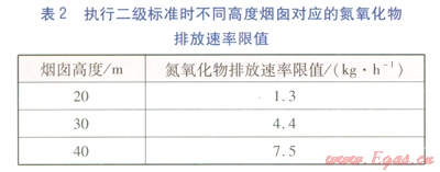 根據(jù)GB 30951996《環(huán)境空氣質(zhì)量標(biāo)準(zhǔn)》規(guī)定,該項目所在地為二類區(qū)(城鎮(zhèn)規(guī)劃中確定的居住區(qū)、商業(yè)交通居民混合區(qū)、文化區(qū)、一般工業(yè)區(qū)和農(nóng)村地區(qū)),應(yīng)執(zhí)行二級標(biāo)準(zhǔn)。根據(jù)GB 16297—1996規(guī)定,執(zhí)行二級標(biāo)準(zhǔn)時不同高度煙囪對應(yīng)的氮氧化物排放速率限值見表2。