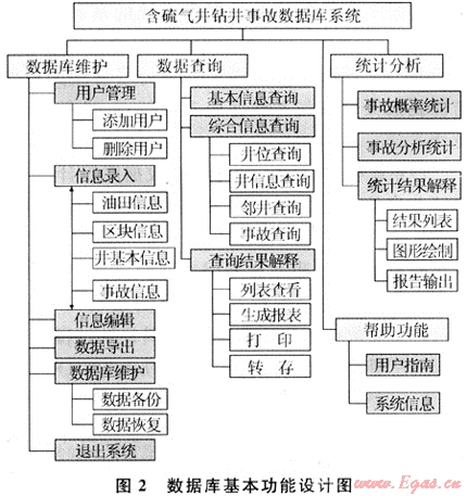 鉆井事故數(shù)據(jù)庫系統(tǒng)主要有如下5大功能模塊:①數(shù)據(jù)管理:完整的數(shù)據(jù)錄入、編輯、刪除等操作。數(shù)據(jù)庫管理設(shè)計的關(guān)鍵問題是如何避免記錄重復(fù)添加、規(guī)范數(shù)據(jù)的輸入格式以及一定的容錯性。a.避免記錄重復(fù),新數(shù)據(jù)與數(shù)據(jù)庫內(nèi)原有記錄不能完全相同。若新輸入的數(shù)據(jù)在數(shù)據(jù)庫中已存在給出提示。b.數(shù)據(jù)庫格式規(guī)范化,數(shù)據(jù)庫對于所輸入的數(shù)據(jù)必須經(jīng)過一定的后臺處理后,才能存儲到數(shù)據(jù)庫文件中。為了保證數(shù)據(jù)存儲的準確性,該數(shù)據(jù)庫系統(tǒng)對所輸入數(shù)據(jù)的格式進行了規(guī)定。c.容錯性,若對每一個數(shù)據(jù)項都進行嚴格的規(guī)定,這無疑會引起數(shù)據(jù)錄入人員的反感,對數(shù)據(jù)錄入人員的技術(shù)水平也提出更高的要求,有些字段沒有必要進行嚴格的格式限制。因此,充分利用Visual Basic內(nèi)部的字符轉(zhuǎn)化程序,有些字段沒有進行格式限制,從而保證系統(tǒng)有一定的容錯性。d.數(shù)據(jù)的完整性,在數(shù)據(jù)編輯過程中所要考慮的首要問題是數(shù)據(jù)庫采用關(guān)系型數(shù)據(jù)庫,同一字段會在多個表中出現(xiàn),在數(shù)據(jù)的修改、刪除操作時,須保證數(shù)據(jù)庫的整體完整性。②數(shù)據(jù)庫備份與恢復(fù):對現(xiàn)有的數(shù)據(jù)庫內(nèi)數(shù)據(jù)定期進行數(shù)據(jù)備份,防止由于系統(tǒng)問題或誤操作造成的數(shù)據(jù)丟失。a.備份文件名稱命名規(guī)則“database”+“備份的日期”(例如2008年5月29日備份的文件名:database20080529.mdb)。b.系統(tǒng)恢復(fù)功能,當數(shù)據(jù)庫內(nèi)部數(shù)據(jù)出現(xiàn)錯誤或者誤操作引起數(shù)據(jù)丟失時,利用先前備份的數(shù)據(jù)庫文件,將數(shù)據(jù)庫恢復(fù)到指定日期。③查詢功能:數(shù)據(jù)庫的查詢功能是數(shù)據(jù)庫的核心功能,該數(shù)據(jù)庫系統(tǒng)共設(shè)計有5種查詢。a.數(shù)據(jù)導(dǎo)航式查詢,將數(shù)據(jù)庫系統(tǒng)所存儲數(shù)據(jù)以樹形結(jié)構(gòu)進行顯示,以方便使用者查詢。數(shù)據(jù)導(dǎo)航式查詢采用“油氣田→區(qū)塊→井→事故”四級導(dǎo)航模式數(shù)據(jù)庫。b.區(qū)塊井位查詢,輸入?yún)^(qū)塊/井名稱查詢井位,有信息則在窗體右邊區(qū)域顯示,若沒有信息則給出數(shù)據(jù)庫中無信息的提示,在顯示區(qū)域可提前設(shè)定顯示比例。c.井的基本信息查詢,多種條件下的復(fù)合檢索,最多支持3個查詢條件。根據(jù)查詢條件的邏輯關(guān)系,在“邏輯關(guān)系”列表框中選擇“并且、或者”。d.鄰井查詢,以井口坐標為依據(jù)查詢鄰井,可以自定義查找半徑。e.事故查詢,事故地質(zhì)、鉆井工藝、鉆井液性能、井口設(shè)備以及事故特征參數(shù)查詢。④統(tǒng)計功能,利用標準SQL語句可以對數(shù)據(jù)庫中的數(shù)據(jù)進行統(tǒng)計、求和等,然后利用Visual Basic中的Ms-chart控件實現(xiàn)統(tǒng)計結(jié)果的繪圖功能。⑤數(shù)據(jù)導(dǎo)出功能:根據(jù)用戶需要將特定的信息從數(shù)據(jù)庫導(dǎo)出到word或者excel文本中。⑥自動報表功能:根據(jù)數(shù)據(jù)庫所存數(shù)據(jù),按照油氣田標準格式打印用戶指定信息。