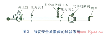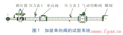 當(dāng)用戶用氣設(shè)備突然停機(jī),會造成調(diào)壓器出口管段內(nèi)壓力瞬間升高,其原因主要是用氣設(shè)備的切斷速度極快(切斷時間小于1s),而調(diào)壓器的閥口關(guān)閉速度慢(34s),調(diào)壓器閥口關(guān)閉的響應(yīng)時間比用戶用氣設(shè)備切斷閥的切斷時間長,造成用戶用氣設(shè)備切斷后,調(diào)壓器上游還有少量氣體輸送至下游,造成下游管段壓力瞬間升高。如何抑制調(diào)壓器出口壓力的突然上升?本文從在調(diào)壓器出口管段上加裝單向閥、加裝安全放散閥以及調(diào)整用戶端用氣設(shè)備控制閥門的關(guān)閉程序等3個方面進(jìn)行試驗(yàn)研究。