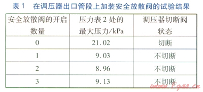 試驗(yàn)方法:調(diào)壓器進(jìn)口壓力設(shè)定為0.4MPa,出口壓力設(shè)定為7kPa,調(diào)壓器切斷閥的切斷壓力設(shè)定為9.8kPa,安全放散閥開啟壓力為8.4kPa。對不開啟安全放散閥、開啟l個安全放散閥、開啟2個安全放散閥及開啟3個安全放散閥這3種工況進(jìn)行試驗(yàn),觀察壓力表2的讀數(shù),試驗(yàn)結(jié)果見表1。