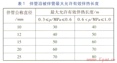 伴管沿被伴管的最大允許有效伴熱長度按表1確定,表1中p為蒸汽壓力。