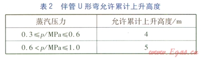 由于被伴管常采用U形補償,以及受到安裝現(xiàn)場實際條件制約,伴管出現(xiàn)U形彎是不可避免的。U形彎的出現(xiàn)將增加伴管的阻力,易產(chǎn)生氣阻和液阻。因此,《規(guī)范》對伴管U形彎允許累計上升高度進行了規(guī)定,見表2。
