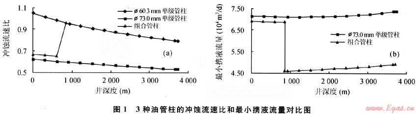 Ø73.0mm單級油管柱、Ø60.3mm單級油管柱和Ø73.0mm×850m+Ø60.3mm×2880m兩級油管柱分別進(jìn)行計算沖蝕流速比,計算結(jié)果見圖1。