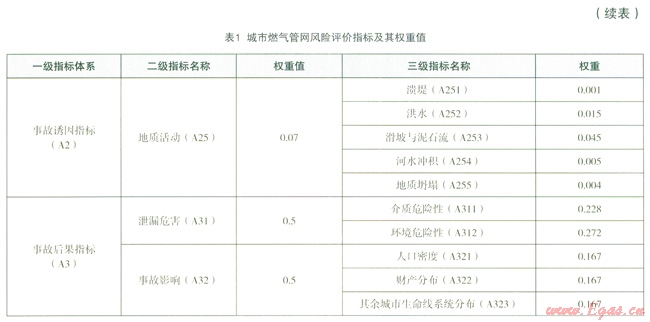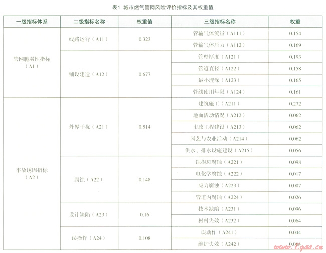 城市管網(wǎng)風(fēng)險(xiǎn)因素間權(quán)重的選擇,參考國(guó)內(nèi)外經(jīng)驗(yàn)[6],[8],各指標(biāo)權(quán)重分配見(jiàn)表1。