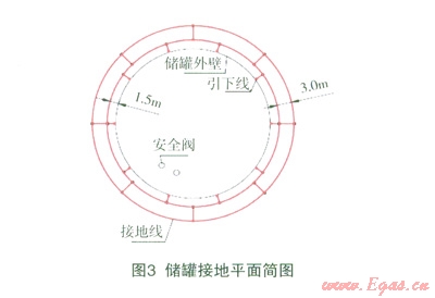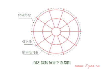 外方設計圖紙中沒有明確全容罐屬于幾類防雷建筑物,但從具體做法上判斷全容罐被劃為第二類防雷建筑物。其中防直擊雷的措施是在全容罐罐頂及罐壁安裝接閃帶,接閃帶采用截面為70mm:鍍錫裸銅絞線組成不大于10m×10m網格,引下線亦為截面為70mm:鍍錫裸銅絞線,間隔不大于10m。接閃帶之間采用壓接方式連接,用膨脹螺栓固定,固定點間距0.9m。對比國內GB50057—2010《建筑物防雷設計規(guī)范》第431款規(guī)定,其防直擊雷設計更趨嚴格,并且在材料選擇上與發(fā)達國家一致。
