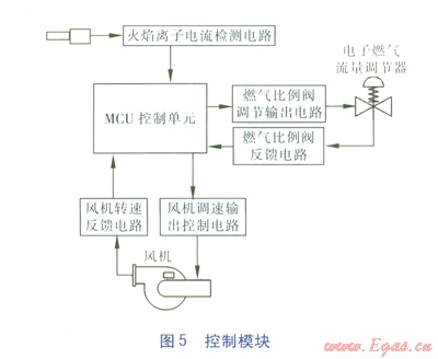 離子電流檢測法燃?xì)庾赃m應(yīng)控制方案應(yīng)用于全預(yù)混壁掛爐見圖4,控制模塊見圖5。燃?xì)庾赃m應(yīng)全預(yù)混壁掛爐具有能實時檢測火焰離子電流信號的功能。設(shè)計者將幾種互換氣種在每種燃燒熱負(fù)荷下的最佳離子電流信號預(yù)先錄入到控制模塊的控制程序中,控制模塊通過檢測離子電流信號來實時控制電子燃?xì)饬髁空{(diào)節(jié)器及變頻風(fēng)機。