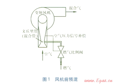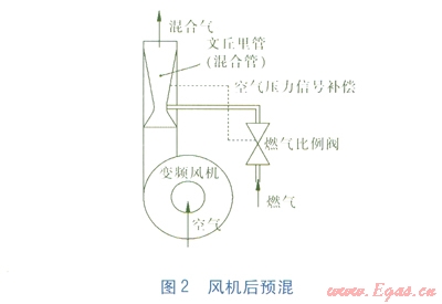 目前市場上的全預(yù)混冷凝式燃?xì)獗趻鞝t(以下簡稱全預(yù)混壁掛爐)主要有風(fēng)機前預(yù)混、風(fēng)機后預(yù)混兩種,分別見圖l、2。變頻風(fēng)機、燃?xì)獗壤y[2-3]提供燃燒所需的空氣與燃?xì)猓諝馀c燃?xì)獍丛O(shè)定好的空燃比進(jìn)行混合燃燒。