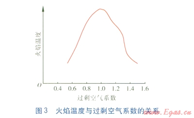 要實現(xiàn)穩(wěn)定的全預(yù)混燃燒,關(guān)鍵在于保持合理、穩(wěn)定的空燃比。實驗證明,全預(yù)混燃燒空燃比過大或者過小都會對燃燒造成不利影響??杖急冗^大時,多余空氣會帶走熱量,火焰溫度降低,熱效率降低;空燃比過小時,燃燒不充分,火焰溫度及熱效率亦降低。同理,當(dāng)空燃比過大時,多余的空氣會稀釋離子;過小時,由于未能充分反應(yīng),燃燒過程未能產(chǎn)生足夠多的離子?;鹧鏈囟扰c過剩空氣系數(shù)的關(guān)系見圖3。由圖3可知,當(dāng)空燃比最佳時,火焰溫度達(dá)到峰值,火焰離子電流也達(dá)到峰值。這是離子電流檢測法用于判斷全預(yù)混燃燒空燃比的理論依據(jù)。
