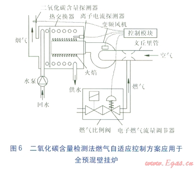 二氧化碳含量探測法燃?xì)庾赃m應(yīng)控制方案應(yīng)用于全預(yù)混壁掛爐見圖6。其控制原理為:二氧化碳含量探測器對煙氣中的二氧化碳含量進(jìn)行實時監(jiān)控,控制模塊接收二氧化碳含量探測器的信號,對信號進(jìn)行邏輯分析。當(dāng)二氧化碳含量偏離設(shè)置值時,控制模塊會迅速輸出電信號給電子燃?xì)饬髁空{(diào)節(jié)器及變頻風(fēng)機,進(jìn)行控制參數(shù)調(diào)整,從而調(diào)整空燃比,使煙氣中的二氧化碳體積分?jǐn)?shù)恢復(fù)到9%左右。需要說明的是二氧化碳含量檢測法燃?xì)庾赃m應(yīng)控制方案中也要有離子電流探測器,用以判斷火焰是否存在。