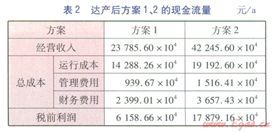 本文采用內(nèi)部收益率(稅前)、凈現(xiàn)值(稅前)、動態(tài)投資回收期(稅前)作為方案經(jīng)濟(jì)性評價指標(biāo)。內(nèi)部收益率的經(jīng)濟(jì)含義是項目在其壽命期內(nèi)未回收資金的預(yù)計收益率,項目投入運營后,投資額將通過每年所產(chǎn)生凈效益的形式逐步得到回收。已回收部分將用于再投資,未回收部分待繼續(xù)回收,內(nèi)部收益率就是指未回收部分的收益率,因此稱為內(nèi)部收益率。凈現(xiàn)值的經(jīng)濟(jì)含義是項目在其壽命期內(nèi)預(yù)計創(chuàng)造的全部凈效益。內(nèi)部收益率、凈現(xiàn)值都是反映項目贏利能力的指標(biāo),前者體現(xiàn)的是相對贏利能力,后者體現(xiàn)的是絕對贏利能力。內(nèi)部收益率、凈現(xiàn)值越大,項目贏利能力越強(qiáng)。動態(tài)回收期越短,說明項目收回投資額的時間越短。方案1、2的經(jīng)濟(jì)性評價指標(biāo)見表3。由表3可知,方案2的內(nèi)部收益率、凈現(xiàn)值均高于方案l,且方案2的動態(tài)投資回收期短于方案l,這說明方案2的經(jīng)濟(jì)性優(yōu)于方案l。