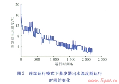 連續(xù)運行模式下蒸發(fā)器出水溫度隨運行時間的變化見圖2。由圖2可知,在整個供暖期內,蒸發(fā)器出水溫度持續(xù)下降。熱泵機組的制熱量根據(jù)末端負荷動態(tài)調節(jié),蒸發(fā)器出水溫度相應出現(xiàn)波動。連續(xù)運行模式下,蒸發(fā)器出水溫度低于5℃的時間約720h,約占整個供暖期的32.6%,最低為1.54℃。因此,當采用連續(xù)運行模式時,易觸發(fā)熱泵機組的保護性停機,導致熱泵空調系統(tǒng)無法運行。