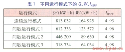 不同運行模式下的Q、W、IHSPF見表l。由表1可知,間歇運行模式下的IHSPF高于連續(xù)運行模式,間歇運行模式1~3的IHSPF接近。