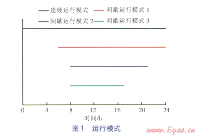 對于地埋管換熱器間歇運行模式,將每日的運行時間與非運行時間之比定義為日開停比。為了比較連續(xù)運行與間歇運行模式以及不同日開停比的間歇運行模式下熱泵機組的性能,選取連續(xù)運行模式和3種間歇運行模式進行對比分析,各運行模式見圖1。間歇運行模式1的日開停比為l8:6,間歇運行模式2為13:11,間歇運行模式3為9-15。模型不考慮地埋管換熱器間歇運行對空調房間供暖的影響,認為地埋管換熱器停用時段由太陽能熱水系統(tǒng)或其他低溫熱源替代土壤源。