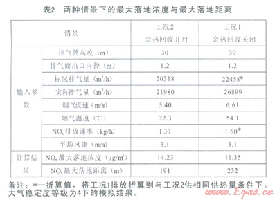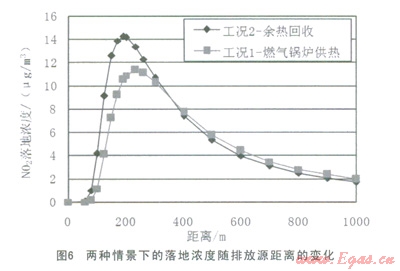 (4)通過實(shí)際煙氣余熱回收與否兩種工況的濃度對比分析,得出:余熱回收工況NOx最大落地濃度略有增加,但是迅速衰減。無論是哪一種工況,其排放均遠(yuǎn)低于《環(huán)境空氣質(zhì)量標(biāo)準(zhǔn)》(GB3095—2012)中的二類區(qū)NO2lh平均值(200mg/m3);且余熱回收工況最大落地距離減小了l7.6%,減小了污染范圍。