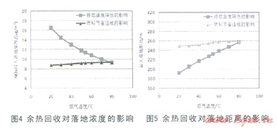 該項(xiàng)煙氣余熱回收技術(shù)對污染物擴(kuò)散的影響可以從兩個方面分析,隨著排煙溫度的降低,一方面:煙氣余熱回收量逐漸增大,供相同的熱量節(jié)省了燃料,燃料的節(jié)省會使NOx排放速率減小,NO2的最大落地濃度減??;另一方面,隨著煙氣溫度的降低,污染物不宜擴(kuò)散,煙氣本體的NO2的最大落地濃度增加,兩種因素的作用一正一負(fù),因此需要對兩方面分別分析其綜合效果。