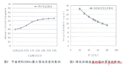(2)最大落地濃度的影響分析得出:因?yàn)楣?jié)能的燃料節(jié)省和排煙溫度降低均對最大落地濃度產(chǎn)生影響,隨著燃料的節(jié)省,最大落地濃度減小,隨著排煙溫度的降低,最大落地濃度增加。排煙溫度降低對落地濃度的影響更為顯著使得總的趨勢是隨著排煙溫度的降低,最大落地濃度增大。