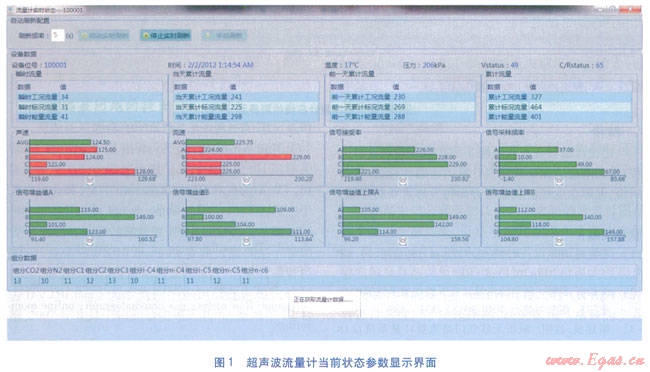 計量結(jié)果及當(dāng)前狀態(tài)參數(shù)模塊主要顯示計量設(shè)備的當(dāng)前狀態(tài)參數(shù)。狀態(tài)參數(shù)可根據(jù)要求分別以柱狀圖、數(shù)字或兩者結(jié)合的形式顯示,監(jiān)控人員可以直觀地觀測計量設(shè)備當(dāng)前運行狀態(tài)是否正常。當(dāng)狀態(tài)參數(shù)出現(xiàn)異常時,相應(yīng)的圖形(或數(shù)字)以紅色顯示(正常時以綠色顯示),以提醒監(jiān)控人員注意。超聲波流量計當(dāng)前狀態(tài)參數(shù)顯示界面見圖l。