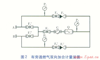 該加合計量裝置由L型三通球閥的開向決定了燃?xì)獾牧鲃臃较虿⒂嬃?,無旁通保證了燃?xì)饬鲃臃较虻奈ㄒ恍?,并?span lang="EN-US">L型三通球閥只有兩個操作方向,操作簡單不易失誤,操作時鎖定L型三通球閥F1并進(jìn)行流量登記。但是,當(dāng)過濾器G、流量計Q有問題或需清洗維修時,該加合計量裝置暫時無法應(yīng)急通氣。