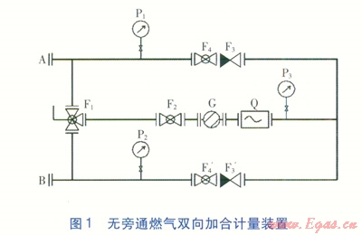 同理,可實現(xiàn)燃?xì)鈴?span lang="EN-US">B端單向流向A端并計量的目標(biāo)。當(dāng)過濾器G、流量計Q有問題或需清洗維修時,可打開旁通球閥F1¢讓燃?xì)馔ㄟ^,以保證加合計量裝置燃?xì)鈶?yīng)急流動的連續(xù)性。