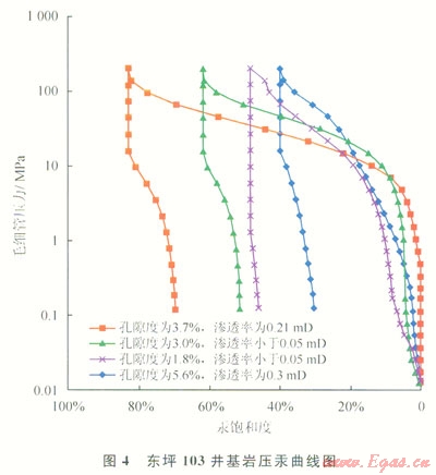 基巖儲層屬于雙重介質(zhì),29個巖樣的物性分析結(jié)果表明:基質(zhì)孔隙度介于1.2%~7.2%,平均為3.4%;滲透率介于0.0540.91mD,平均為0.19mD,儲層致密。壓汞實驗結(jié)果表明:基質(zhì)排驅(qū)壓力在7MPa以上,部分樣品推測受裂縫影響,沒有平直段,排驅(qū)壓力較低(4);進汞飽和度介于30%~80%。目前僅有4塊壓汞實驗樣品,實驗結(jié)果差異較大,也反映了基巖微觀非均質(zhì)性較強,其礦物溶孔和裂縫的分布差異較大。