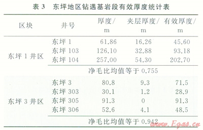 根據(jù)鉆至基巖井的測井解釋成果,基巖體內(nèi)縱向小層劃分和井間小層對比是困難的,說明致密層或隔夾層的連片性差(5),難以形成穩(wěn)定的遮擋層,造成縱向開發(fā)單元的劃分難度較大。特別是東坪3井區(qū)凈毛比均值達到0.942,說明基巖塊狀體內(nèi)隔夾層很少。