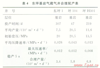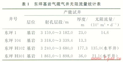 東坪1井區(qū)基巖層試采井有3口,實際單井日產(chǎn)氣12×10418×104m3,壓降速率為0.0260.038MPad。平均單井日產(chǎn)氣7.8×10419.8×104m3,壓降速率0.0160.029MPad。該井區(qū)基巖層試采產(chǎn)量較高,壓力高,也說明基巖儲層物性好。