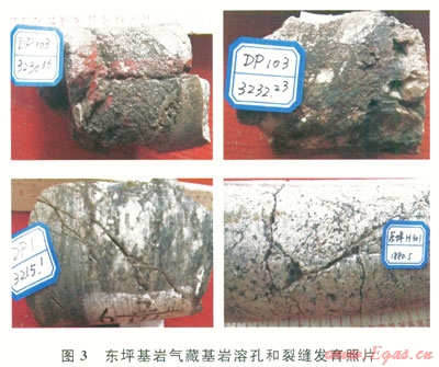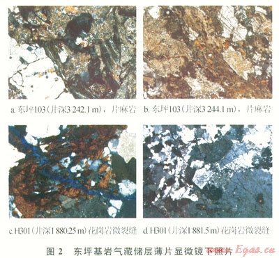 1)東坪1井區(qū):主要以花崗片麻巖為主。從巖心上可觀察到高角度裂縫發(fā)育,裂縫寬度為12mm,裂縫發(fā)育程度好。東坪103井井深3200m靠近基巖風化殼,可觀察到風化溶蝕孔洞(3),但總體上發(fā)育較少。巖心裂縫十分發(fā)育,多數(shù)巖心呈碎塊狀態(tài)。