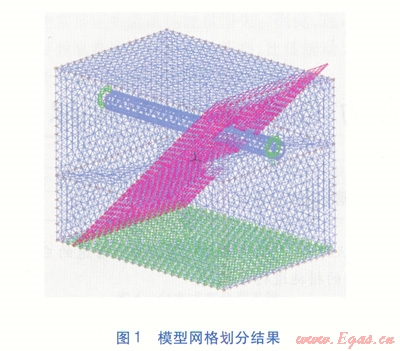 斷層是土體之發(fā)生相對(duì)位移的破裂面,斷盤指斷層兩側(cè)的巖土,位于斷層之上的稱為上盤,斷層之下的稱為下盤。將斷層運(yùn)動(dòng)考慮為其中一盤相對(duì)靜止,另一盤相對(duì)該盤運(yùn)動(dòng),將約束加在相對(duì)不動(dòng)的一盤上。設(shè)定上盤為運(yùn)動(dòng)盤,下盤為相對(duì)靜止盤。重力荷載直接加到整個(gè)模型上,方向垂直向下;位移荷載加到上盤,方向沿?cái)鄬觾A角斜向下;地震力集中作用到上盤。模型網(wǎng)格劃分結(jié)果見圖1,管道選用8節(jié)點(diǎn)網(wǎng)格,土體選用4節(jié)點(diǎn)網(wǎng)格。