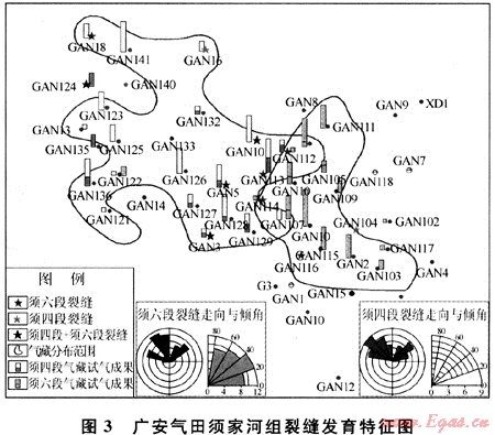 廣安氣田的須六段與須四段儲(chǔ)層總體上裂縫比較發(fā)育,在成像測(cè)井圖上[11],整個(gè)廣安構(gòu)造共有13口井發(fā)育裂縫(圖3),須四段與須六段的裂縫發(fā)育特征相似,裂縫走向主要有北西和北東向2組,中低傾角,發(fā)育井位多數(shù)重合,反映其可能在同一應(yīng)力場(chǎng)下形成。其中須六段裂縫主要發(fā)育在下亞段,共有9口井測(cè)井時(shí)發(fā)現(xiàn)裂縫,以低角度縫為主,部分發(fā)育水平縫和高角度縫,但氣藏分布范圍內(nèi)只有2口井(廣安105和廣安107井)發(fā)育裂縫,共發(fā)現(xiàn)5條張開(kāi)裂縫,其余裂縫發(fā)育井均不在探明儲(chǔ)量范圍內(nèi)。因此須六段氣藏的主要儲(chǔ)集空間是孔隙,裂縫不是影響產(chǎn)能的主要因素。