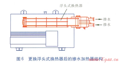 將原加熱盤管拆除(見圖4),更換成浮頭式換熱器(見圖5)。改造完畢后,按要求試壓。1臺摻水加熱爐安裝1臺浮頭式換熱器,另制造1臺浮頭式換熱器作為3臺摻水加熱爐的備用換熱器。當某臺浮頭式換熱器結垢嚴重,需要清垢時,先停爐拆下該浮頭式換熱器,更換上備用換熱器,然后摻水加熱爐繼續(xù)運行,從而減輕對正常運行的影響。更換浮頭式換熱器后的摻水加熱器結構見圖6。