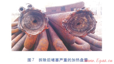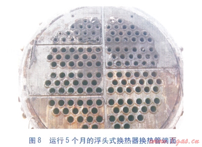 3臺摻水加熱爐于201210月陸續(xù)改造完成,并同期投產(chǎn)運行。改造后的3臺加熱爐運行情況基本平穩(wěn),直至20133月才陸續(xù)出現(xiàn)換熱效率低的現(xiàn)象。原加熱盤管基本兩個月就需要酸洗一次,酸液對金屬的腐蝕性強,易揮發(fā)產(chǎn)生酸霧污染原油,降低管道及設備的使用壽命[1]。而且隨著運行時間的延長,酸洗的次數(shù)增加,加熱盤管內壁結垢傾向越來越嚴重,酸洗也變得無能為力。而改造后的浮頭換熱器能夠通過機械通洗繼續(xù)使用,清洗周期也比原加熱盤管有所延長。拆除后堵塞嚴重的加熱盤管見圖7,運行5個月的浮頭式換熱器換熱管端面見圖8。實踐充分證明,采用浮頭式換熱器替代蛇形加熱盤管,內壁涂覆防垢涂層并提高摻水流速,有效地延緩了清洗時間。浮頭式換熱器可抽出,方便清洗,確保了原油正常生產(chǎn)。