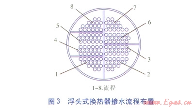 浮頭式換熱器摻水流程布置見圖3。流程1為進水,流程8為出水。摻水由流程1進入換熱器后,依次流經(jīng)流程2、34、56、7,最后由流程8流出。