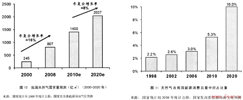 綜上所述,我國天然氣行業(yè)未來幾年仍將保持高速增長。國家發(fā)改委能源局油氣處預(yù)測未來天然氣需求仍將保持快速增長,2010年天然氣需求將達到1400億m3,2020年將達到2037億m3,2010年至2020年復合增長率達到8%(見圖10)。此外,天然氣在中國能源消費總量構(gòu)成中的占比逐年提高,預(yù)計到2010年將達到5.3%,到2020年將達到10%(見圖11)。
