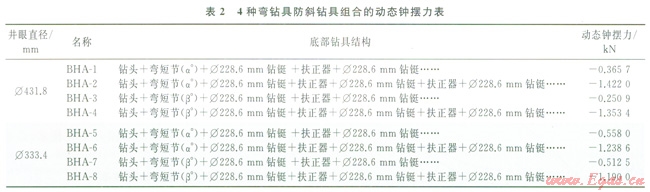 塔里木山前高陡構(gòu)造井斜控制[7]是空氣鉆井難題之一,空氣錘防斜技術(shù)[8]難以奏效,基于鉆具動(dòng)力學(xué)特性分析,提出一種“彎鉆具動(dòng)力學(xué)防斜技術(shù)”[9-10],對4種不同鉆具組合的動(dòng)態(tài)鐘擺力進(jìn)行了分析,優(yōu)選出Æ431.8mm和Æ333.4mm井眼的“彎短節(jié)+雙扶正器”的動(dòng)力學(xué)防斜鉆具組合(表2),其底部鉆具組成為:鉆頭+彎短節(jié)(a°)+Æ228.6mm鉆鋌+扶正器+Æ228.6mm鉆鋌+扶正器+Æ228.6mm鉆鋌……