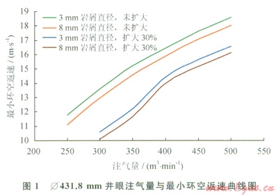采用最小動(dòng)能法判斷標(biāo)準(zhǔn):l]確定合理灃氣量,該方法認(rèn)為:當(dāng)環(huán)空空氣最小返速不小于15.24m/s時(shí),能將井底產(chǎn)生的巖屑攜帶至地面。根據(jù)實(shí)際鉆屑情況,模擬計(jì)算了Æ431.8mm和Æ333.4mm兩種井眼尺寸,考慮不同井眼擴(kuò)大率,不同巖屑顆粒尺寸條件下的最小環(huán)空返速,參照最小動(dòng)能法判斷標(biāo)準(zhǔn),確定出合理注氣量(表1,圖1、2)。