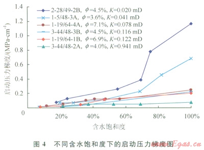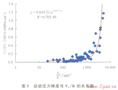 式中l為啟動壓力梯度,MPacm;Sw為含水飽和度;K為巖石滲透率,mD
