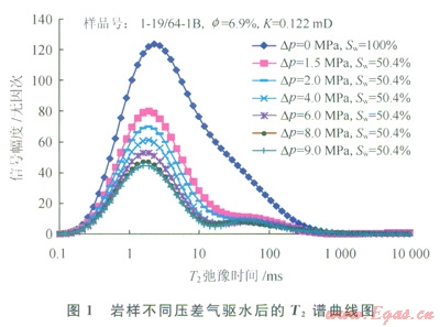 經(jīng)過成藏作用后,巖石孔隙中各類孔、喉中均有水的賦存,其賦存狀態(tài)受控于孔喉大小、形狀以及巖石表面物理性質(zhì)等[12],對于氣藏儲層來說,一般在細小孔喉處賦存的水較多。通過巖樣飽和水后進行氣驅(qū)水和核磁共振實驗,分析了登婁庫組巖石中水的賦存特征。巖樣含水飽和度為100%時測試的核磁共振T2譜曲線反映的是孔隙內(nèi)全部水體積,曲線下包面積代表了巖樣的全部孔隙體積。在不同壓差氣驅(qū)水后(氣驅(qū)水過程的驅(qū)替壓差由小到大逐步增加),巖樣達到不同含水飽和度,隨著氣驅(qū)壓差的增大,巖樣含水飽和度降低,T2譜曲線下降(1),相鄰T2譜曲線之間的面積代表了兩條曲線對應(yīng)驅(qū)替壓力變化所引起的可動流體變化量,因此由相鄰T2譜曲線之間的面積分布及大小可看出可動水來自哪些孔隙及總量多少[13]