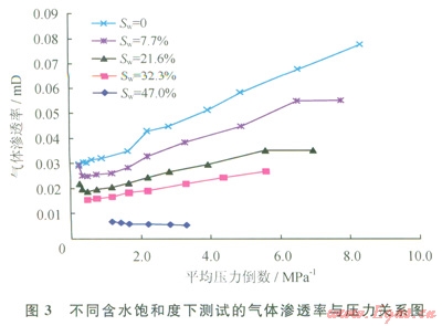 前人研究表明[14-16],致密砂巖中由于復(fù)雜的孔隙結(jié)構(gòu),氣體滲流存在非達西特征。筆者通過氣驅(qū)水實驗分析表明,當驅(qū)替壓差較小時,氣體不能驅(qū)動水形成流動,只有當驅(qū)替壓差大于某一臨界值,足以克服水鎖產(chǎn)生的毛細管阻力才能發(fā)生流動,這在滲流曲線上表現(xiàn)為啟動壓差。對同一巖樣,其含水飽和度越高,氣體始流動所需的驅(qū)動壓差越大,氣體開始流動后,驅(qū)替壓差越大流量越大;巖樣含水飽和度越低,相同驅(qū)替壓差下流量越大。但是,壓差增大滲透率不一定變大,當巖樣含水飽和度較高時,隨著驅(qū)替壓差的增大(平均壓力倒數(shù)減小),氣體滲透率有的增加,有的減小;當巖樣含水飽和度較低時,隨著驅(qū)替壓差的增大(平均壓力倒數(shù)減小),氣體滲透率普遍呈先降低后增加的特點,這是因為前期主要受滑脫效應(yīng)的影響,而后期,當平均壓力倒數(shù)低于一定程度后(即驅(qū)替壓差大于一定值后),這時氣體帶動部分孔隙中的水流動,或使孔隙壁的水膜變薄,氣體滲流通道增加。因此氣體滲透率開始增加(3)。含水飽和度越高,這種水的可動性對氣體滲流的影響越明顯。