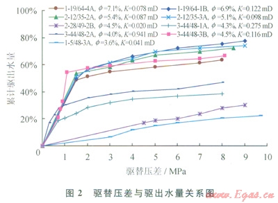 2是不同物性巖樣的實驗結(jié)果,由于巖樣初始狀態(tài)為完全含水,含水飽和度在氣驅(qū)壓力起始點下降較大(累計驅(qū)出水量大),隨著氣驅(qū)壓力增加,含水飽和度下降幅度減小。不同壓差氣驅(qū)后含水飽和度下降幅度受孔隙度影響大,孔隙度大的巖樣含水飽和度最終下降幅度一般較大,而孔隙度相近的巖樣,滲透率小的飽和度最終下降幅度則小。
