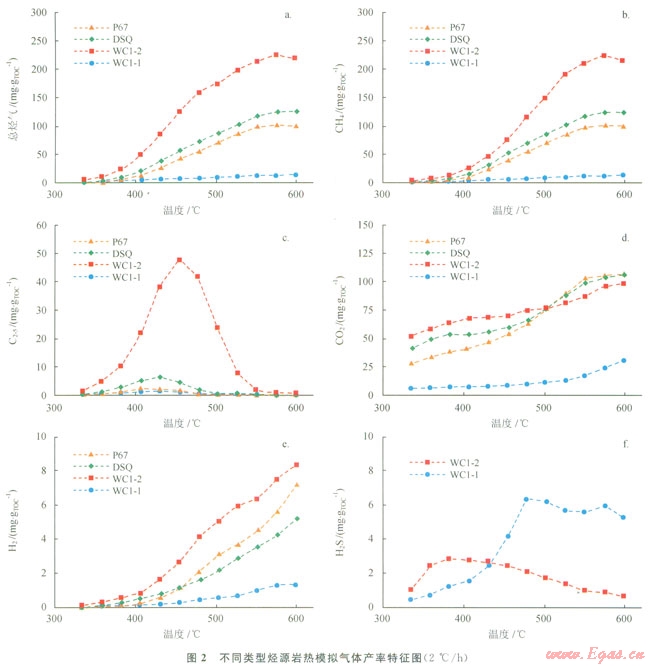不同類型的烴源巖熱模擬產(chǎn)物中非烴類氣體有CO2、H2S、H2、N2等,且均以CO2為主(圖2-d),并有少量的H。產(chǎn)生(圖2-e),其含量多少與烴源巖所處沉積環(huán)境有著密切關(guān)系。其中,CO2和H2的產(chǎn)率隨溫度的升高呈增加的趨勢(shì);H2S則表現(xiàn)為先增加后減少的趨勢(shì)。WC1-1樣品的CO2和H2產(chǎn)量在所測(cè)試的樣品中產(chǎn)量均最低,但是卻占了其總產(chǎn)氣量的70%以上,說(shuō)明該類烴源巖以產(chǎn)非烴類氣體為主,產(chǎn)烴類氣的能力有限。WC1-1和WC1-2樣品有少量的H2S氣體產(chǎn)生(圖2-f),說(shuō)明弧間盆地島弧背景下受火山活動(dòng)影響,使得烴源巖中硫化物的含量相對(duì)于其他沉積環(huán)境明顯增高,而硫化物的存在對(duì)于酪根的裂解生烴有催化作用,有利于提高干酪根的熱解生烴產(chǎn)率[12]。這可能是WC1-2樣品具有相對(duì)高烴產(chǎn)率的重要原因。