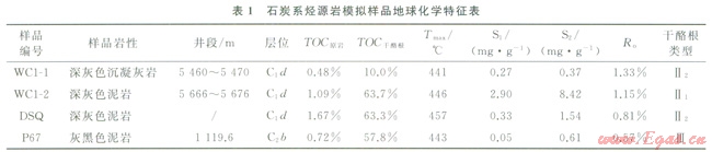 石炭系經(jīng)歷了漫長(zhǎng)的地質(zhì)時(shí)期,無(wú)論是鉆井巖心還是地表露頭,烴源巖的熱演化程度相對(duì)較高。為了保證模擬數(shù)據(jù)的準(zhǔn)確性和代表性,選取排67井(P67)、烏參1井(WC1-1、WC1-2)和滴水泉露頭剖面(DSQ)成熟度相對(duì)較低的樣品進(jìn)行熱模擬實(shí)驗(yàn)。P67樣品處于殘留洋盆濱淺海相,烴源巖母質(zhì)以陸源高等植物供給為主,干酪根類型為腐殖型(Ⅲ型)。DSQ樣品處于弧后盆地溺湖相沉積環(huán)境,受陸源供給影響較大,干酪根類型以偏腐殖混合型(Ⅱ2型)為主。為了分析火山活動(dòng)強(qiáng)度對(duì)烴源巖品質(zhì)的影響,選取了同為弧間盆地濱淺海相的WC1-1和WC1-2兩個(gè)樣品,其中WC1-1樣品形成于火山強(qiáng)烈活動(dòng)期,受火山活動(dòng)影響明顯,巖性為深灰色沉凝灰?guī)r,有機(jī)碳含量為0.48%,為高等植物和低等水生生物的偏腐殖混合型(Ⅱ2型)干酪根;WC1-2為火山噴發(fā)間歇期正常沉積的深灰色泥巖,有機(jī)碳含量為1.09%,有機(jī)質(zhì)類型為以低等水生生物主的偏腐泥混合型(Ⅱ2型,見(jiàn)表1)。