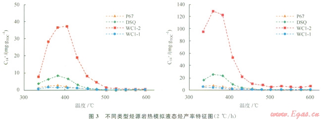 從烴源巖生烴演化規(guī)律分析,WC1-2和DSQ樣品具有相似的輕烴和重?zé)N生成演化規(guī)律,即隨著溫度的升高,烴產(chǎn)率迅速增加,達(dá)到產(chǎn)率高峰后,隨著溫度的繼續(xù)升高烴產(chǎn)率反而下降。C14+重?zé)N的高峰值對(duì)應(yīng)溫度為360℃左右,而C6-14輕烴的高峰值對(duì)應(yīng)的溫度為380~400℃,明顯滯后于重?zé)N,說(shuō)明在溫度高于360℃時(shí)液態(tài)烴中的重?zé)N進(jìn)一步裂解成輕烴,當(dāng)溫度超過(guò)480℃時(shí),幾乎不再有液態(tài)烴的產(chǎn)生。