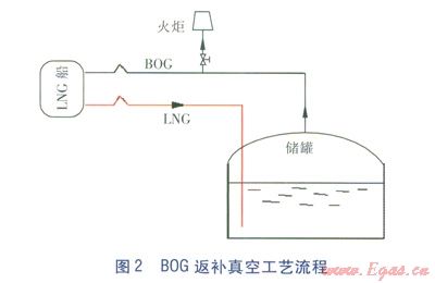LNG船在向儲罐卸裝液體時,由于液體流出而產生真空,增加了液體卸裝的阻力,極大地增加了耗能,甚至使LNG船上的液體無法完全卸入罐內。因此,LNG接收站接收LNG時,需要及時填補LNG船艙由于液體流出所形成的真空。如采用其他氣體返補真空,既會引入新的雜質,又會造成熱量大量流,加速LNG氣化。而LNG儲罐中產生的BOG溫度大約在-140150℃,將BOG通過氣體返回線流回船艙填補真空,可以很好地避免上述問題。時在BOG返回船艙時,船艙內大量LNG提供的冷量使得BOG重新液化,在一定程度上回收了BOG[7]。BOG返補真空工藝流程見圖2。