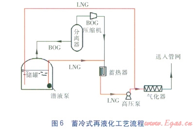 為了克服LNG外輸量小導致所提供的冷量不足以將BOG再液化的問題,在以上基礎上發(fā)展了蓄冷式再液化工藝,流程見圖6。