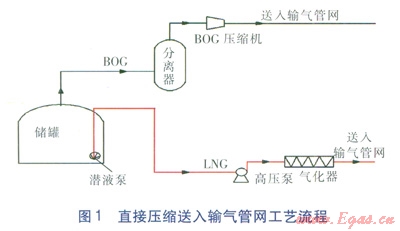 該工藝流程簡單,設備少,可以節(jié)約造價,因此,在實際中被較多采用,比如日本大阪瓦斯和東京瓦斯公司等的LNG接收站的BOG處理就是采用了這種方法[8]。但是這種方法能耗大,受下游用氣量影響較大,適應性不強,而且BOG所攜帶的大量冷能消耗于壓縮機的壓縮過程,未得到利用,造成了浪費。