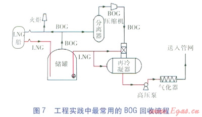 該方法雖然能夠在一定程度上對BOG進行回收,但在BOG量比較大的情況下顯然不能夠滿足處理的需求,無法獨立使用。而且這種方法只有在LNG船卸料時才能平衡掉一部分氣體,限制了其應用范圍。