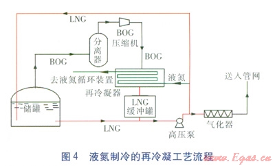 再冷凝過程中,采用外部制冷介質(如液氮)提供冷量使BOG液化為LNG的工藝流程見圖4,液氮和丙烷是兩種比較常見的制冷劑[13-14]。