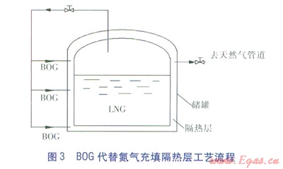 BOG氣體需要及時排出以維持儲罐的微正壓,一個辦法是使用BOG代替氮氣充填隔熱層。利用BOG充填絕熱層只需在原儲罐基礎上稍加改造就可實現,投資很少,可以省去制氮設備,經濟高效,且熱量流入時首先會被低溫的BOG氣體吸收,儲罐的隔熱效果更好。俞樹榮、席家福[10]在這方面進行了探索和論證,并對BOG充填隔熱層進行了傳熱分析,給出了具體的計算,提出了BOG代替氮氣充填隔熱層的工藝流程(見圖3)。但是,充填隔熱層用量對于大型儲罐的日產BOG量來說比較小,并不能從真正意義上減少BOG的排放。